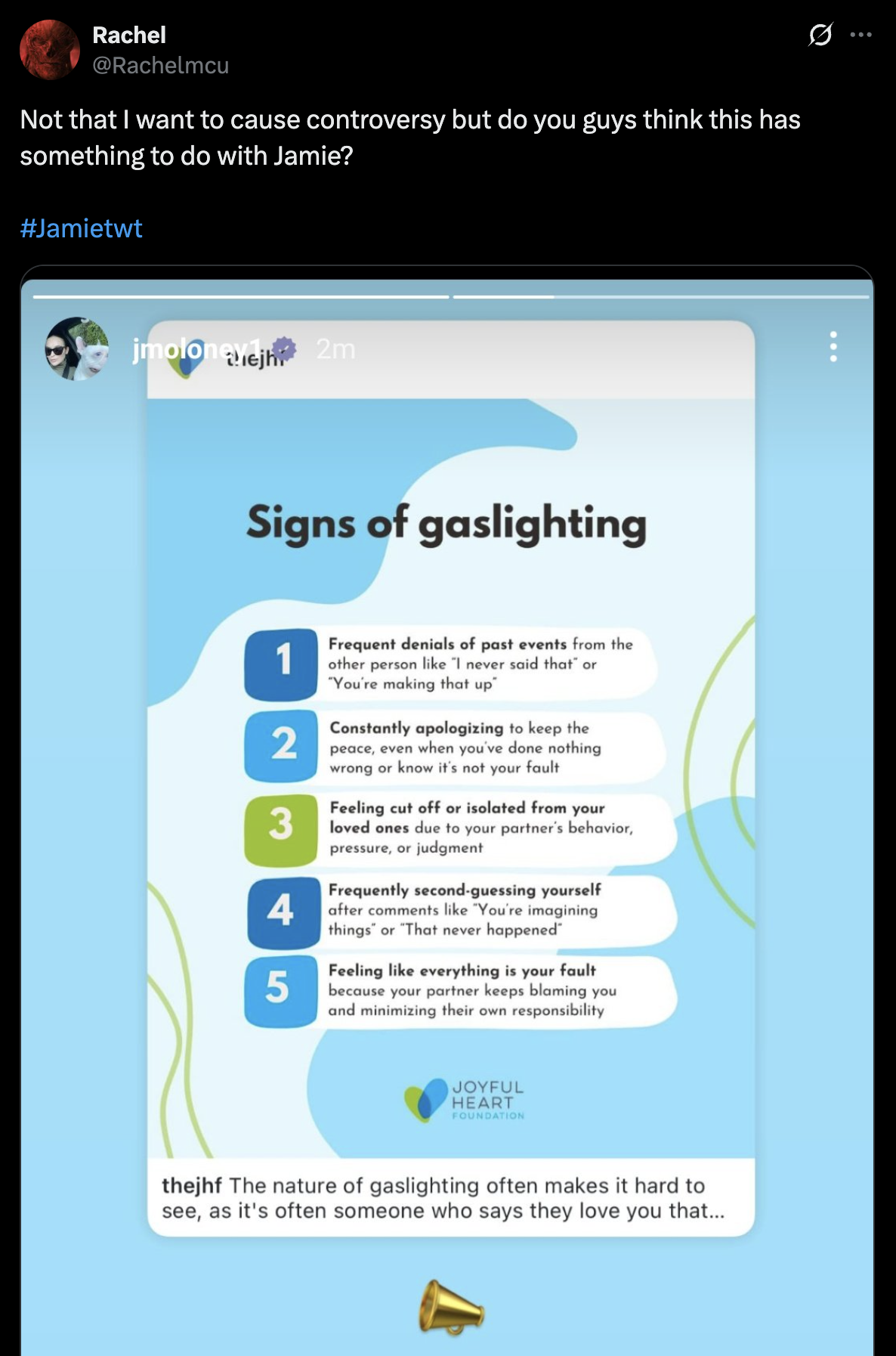 In an IG story posted just a few days prior to me writing this, she had this up. It seemingly did it's job since it got at least one Jamie fan to post on twitter asking if they think Jess means Jamie was abusive.