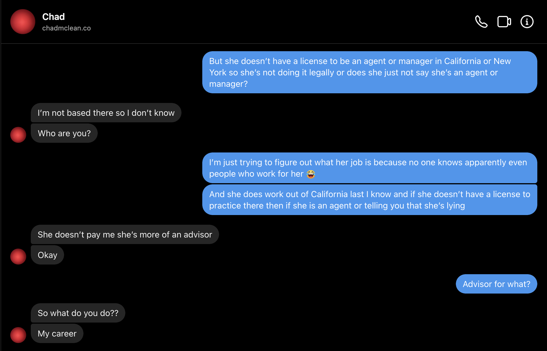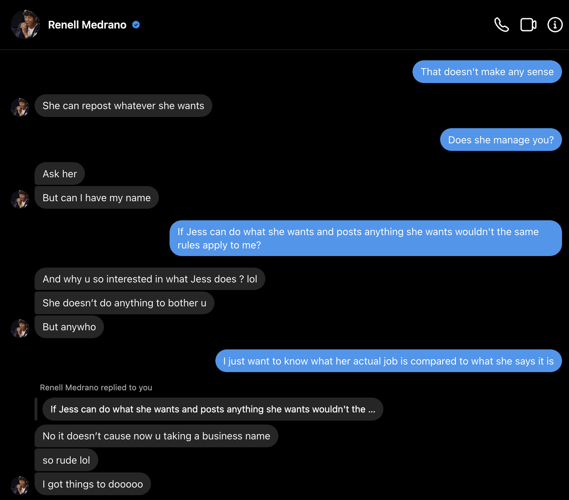 This pattern of behavior is not surprising because this has happened before. When approaching other people within her circle to ask what her job is, the usual reaction is for them to immedaitely block me. At least two others started insulting me immediately. Two started to question my mental health as if it's the craziest question in the world to ask what someone's job is. Her own alleged clients who she allegedly manages (Quil Lemons and Renell Medrano) refuse to give straight answers about this or in Quil's case, any answer at all. I also know that if you check Quil's website he doesn't list a manager to contact for him, he appears to be freelance.