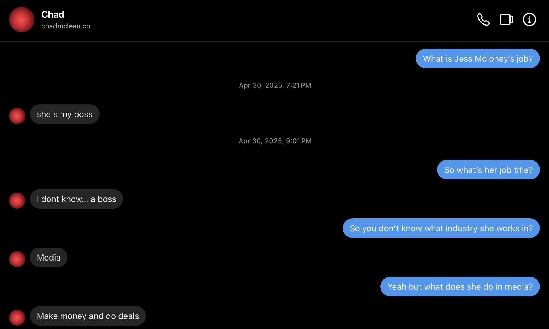(Screenshot of DM transcript on Instagram with Chad McClean, Possible Colleague Or Client Of Jess Moloney)