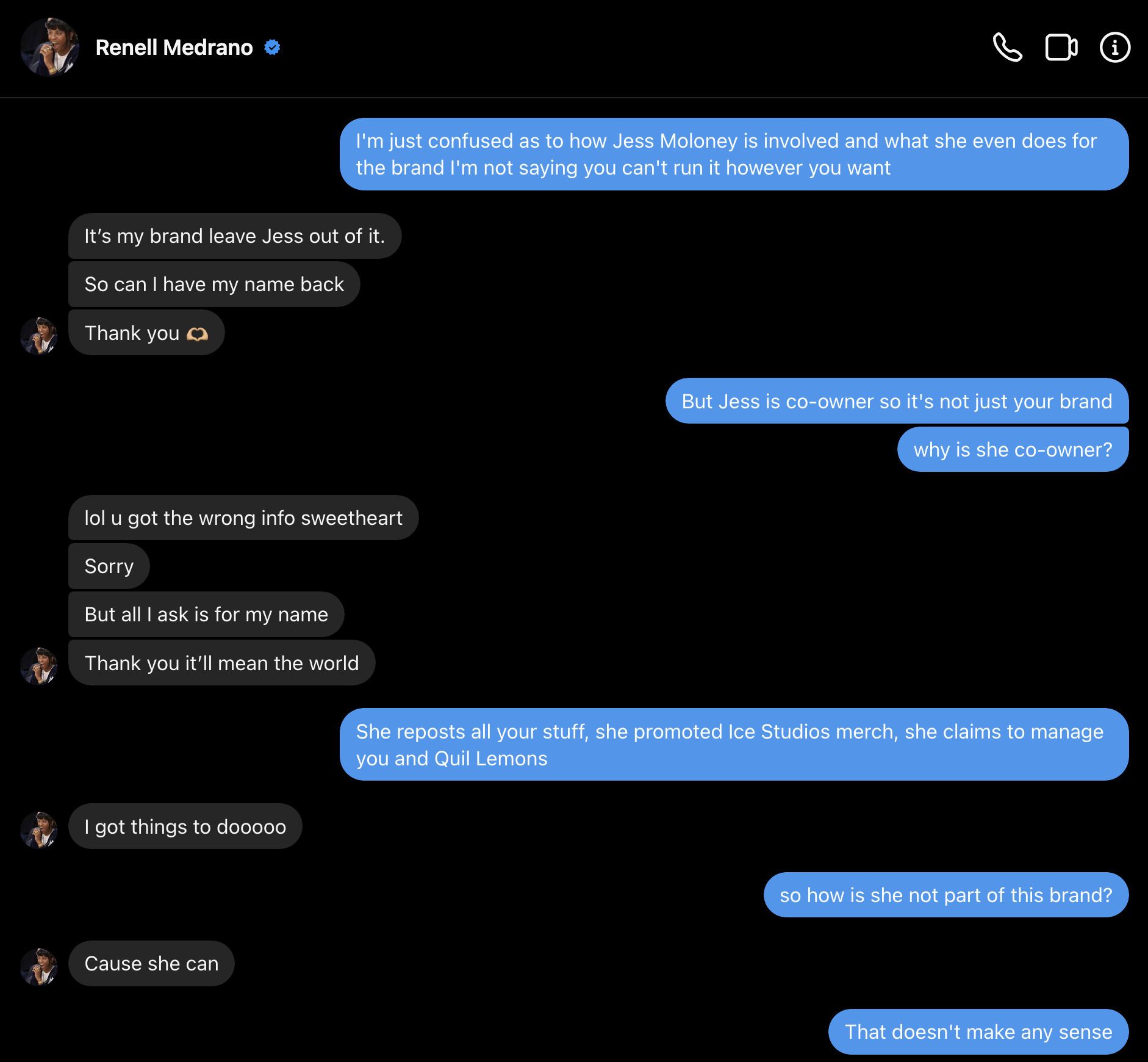 However on this website (on a subpage that is not linked from their homepage) it says that Jess Moloney is co-founder of Ice Studios as well (source). So given that there are at least a few sources that cite Jess as co-founder of this organization, brand, agency, community, or whatever they want to call it why is it that when directly asked, Renell says that it's her brand and to leave Jess out of it? Why has Renell never mentioned Jess as an integral part of founding these studios? Why does Jess claim the credit she claims if Renell won't confirm or back it up when asked? However, we then move on to this part of the conversation.